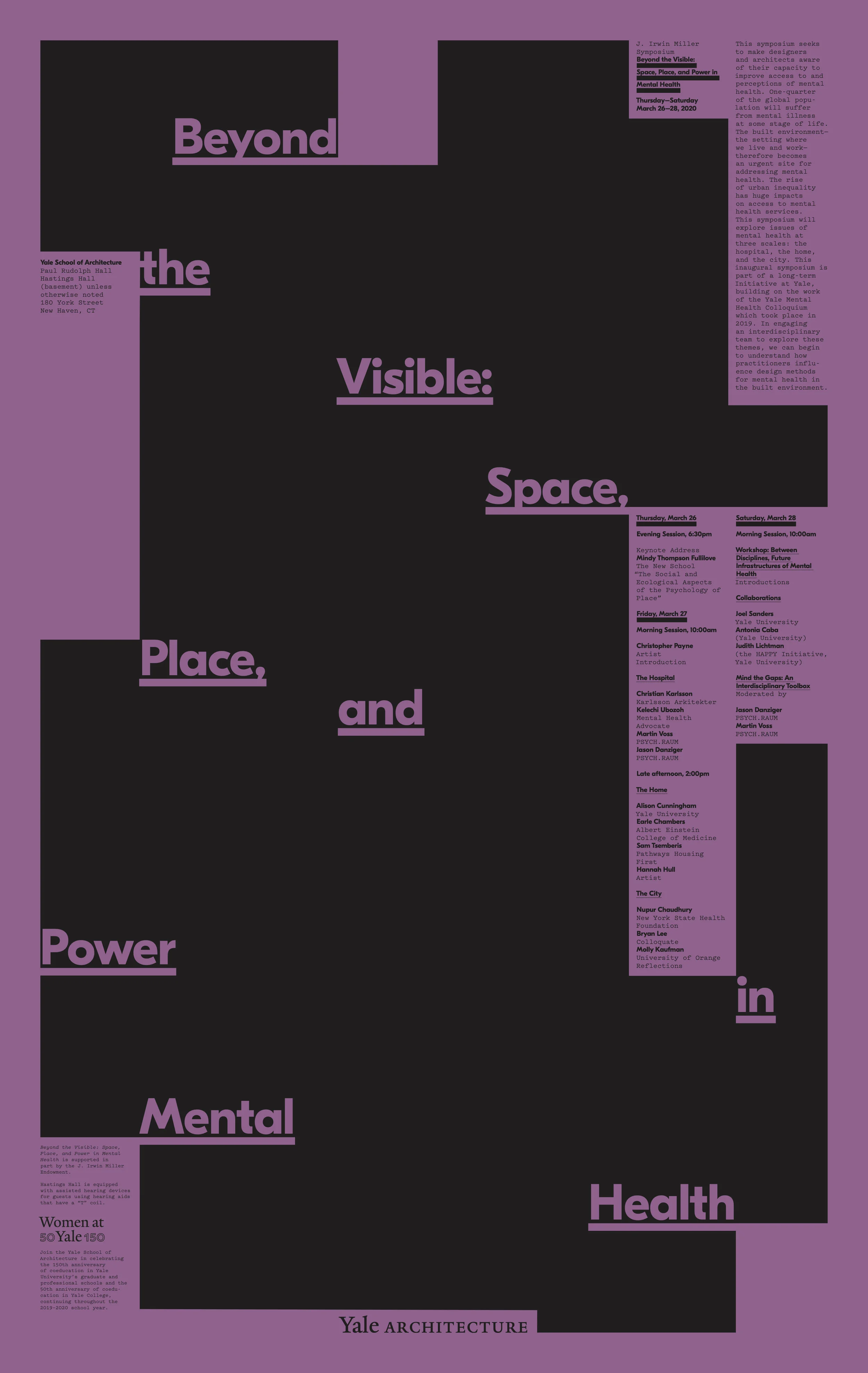 “Beyond the Visible: Space, Place, and Power in Mental Health” is a digital symposium that runs from September 10-24, 2020. It provides an interactive experience in which Zoom panels, talks, comments, and online discussions will be woven together to form a dynamic discussion between many interest groups.